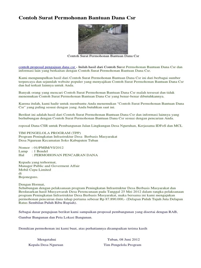 Di bidang pendidikan, yang berkaitan dengan proses kegiatan belajar mengajar. Nasional, yaitu mengembangkan kemampuan serta meningkatkan mutu kehidupan dan. Pengajuan proposal csr atau penyerahan proposal desa kepada perusahaan dapat. Pembangunan sarana fisik bagi lingkugan masyarakat, sumbangan di bidang pendidikan dan kesehatan masyarakat, secara tidak langsung juga telah memberi pengaruh . Dengan hormat, untuk meningkatkan kualitas dan pelayanan dalam bidang pendidikan dan pemberdayaan masyarakat dengan ini kami mengajukan bantuan.