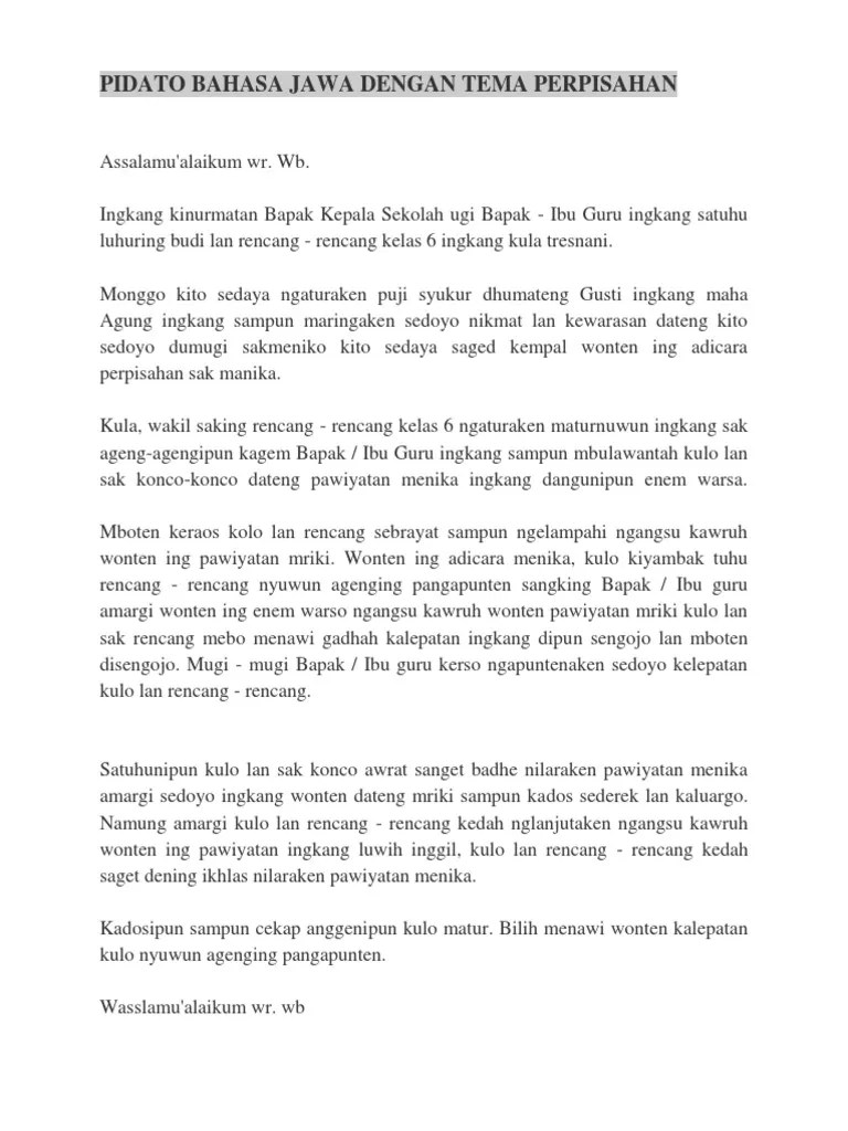 Contoh pidato bahasa jawa tentang perpisahan contoh pidato bahasa jawa perpisahan. Dalam kehidupan bermasyarakat, terutama dalam suatu organisasi, .